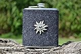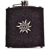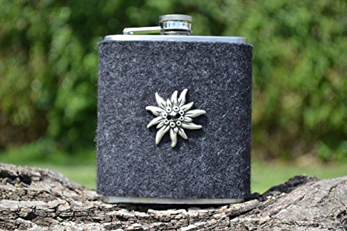 Der Flachmann im alpinen Look ist ein stilvoller Begleiter – egal, ob bei der Bergtour, auf dem Oktoberfest und beim Rock-Festival. Die Edelstahlflasche ist mit grauem Filz ummantelt, der gleichzeitig vor Kratzern schützt, isoliert und natürlich für den feschen Auftritt sorgt. Unverschnörkelt und dezent prangt ein silbernes Edelweiß auf der grauen Filzmanschette – das gefällt Männern genauso gut wie Frauen und macht die Taschenflasche Edelweiß zu einem großartigen Geschenk. Die Taschenflasche ist der Hingucker in jeder Runde und stets griffbereit – in guten wie in schlechten Zeiten.