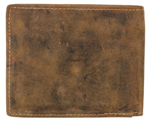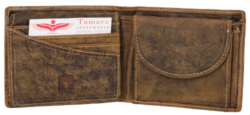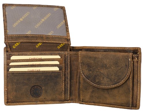Rustikale Geldbörse 1 Münzfach mit Druckknopf 2 Fächer für Scheine 2 tiefe Steckfächer 1 Steckfach 6 Steckfächer für Kreditkarten 1 Ausweisfach Marke: Greenburry Typ: Geldbörse Modell: Vintage Material: Rindleder gebürstet/gewachst Farbe: antikbraun Maße: 12x10x3,5cm Format: Trifold quer