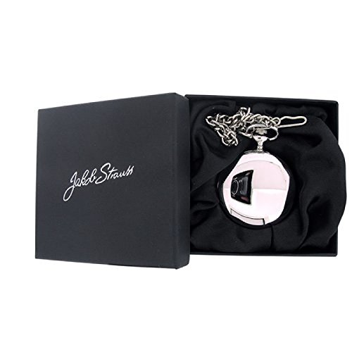 Eine stabile und robuste Taschenuhr von Jakob Strauss. Dieser Zeitmesser kommt mit einer 30/31cm langen, silberfarbenen Kette.