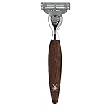 R873 – 3-Klingen-Rasierer, zur Verwendung von Gillette Mach 3 Rasierklingen, Griff aus Mooreichenholz, Details aus verchromtem Messing, in hochwertiger Geschenkverpackung.